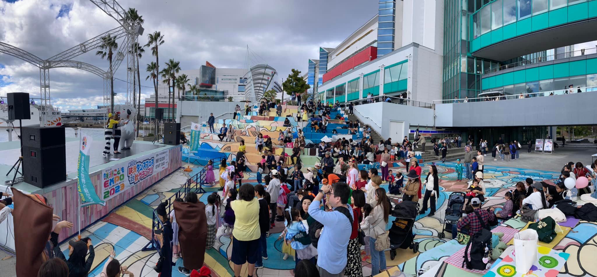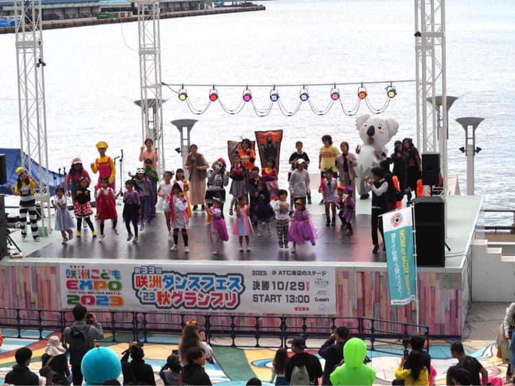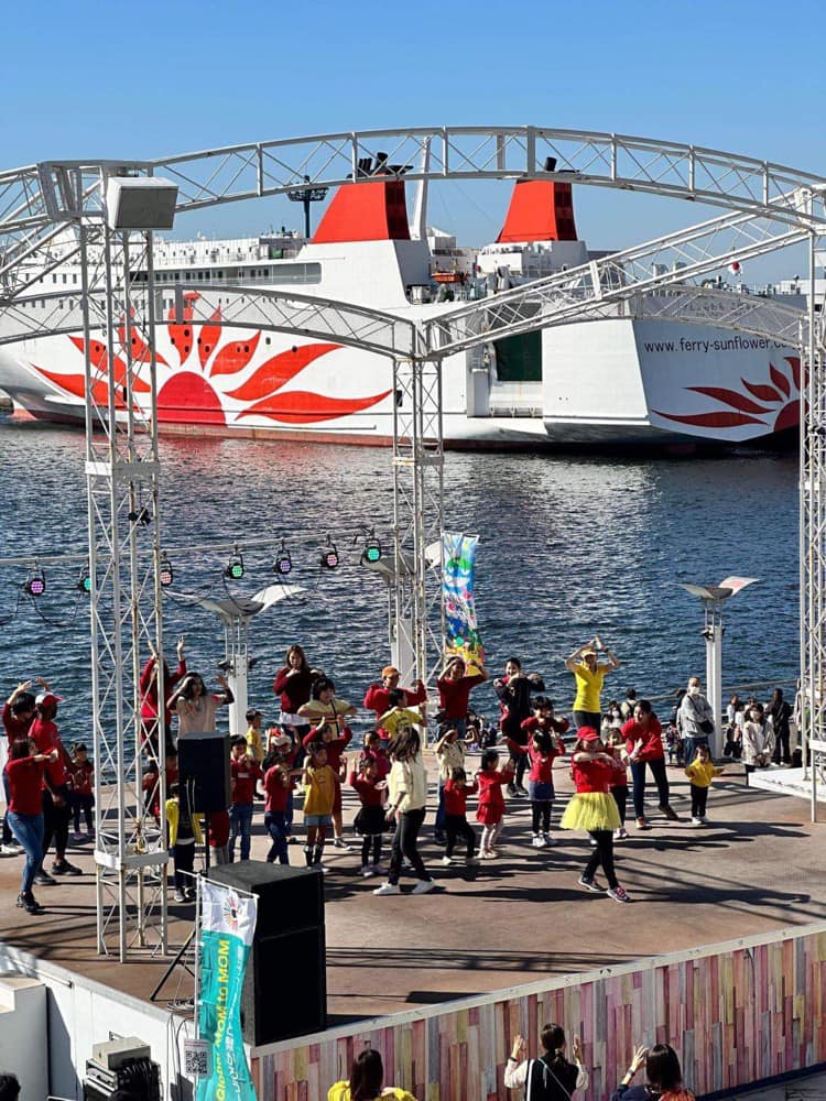 海の前のステージでGlobal MOM to MOMのキッズが英語パフォーマンスを披露します。